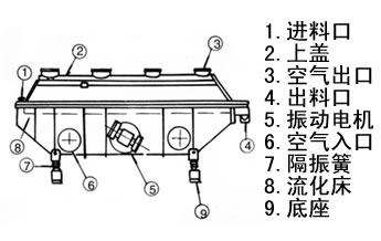 所谓振动流化床就是在普通流化床的基础上施加振动而成。振动流化床干燥机是由振动电机产生激振力使机器振动,被处理物料就是在这给定方向的激振力的作用下跳跃前进,同时流化床底部输入的热风使物料处于流化状态。物料与热风充分接触,从而达到理想的干燥效果。